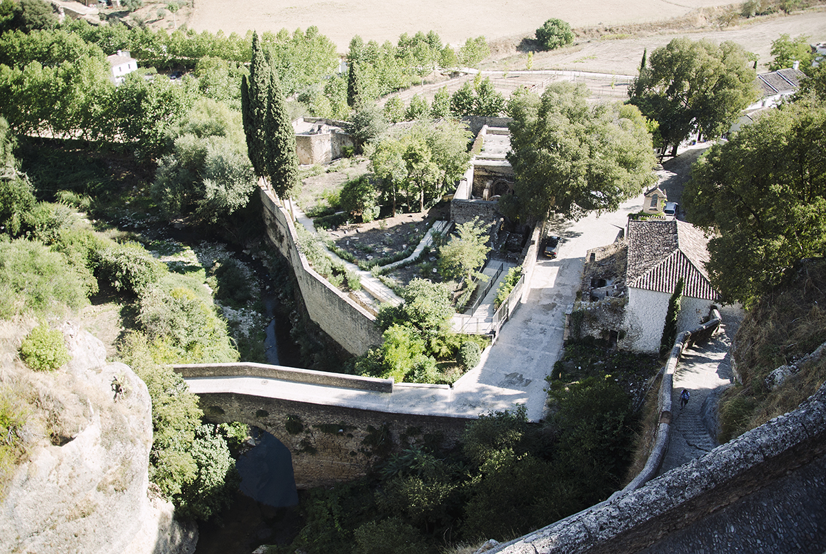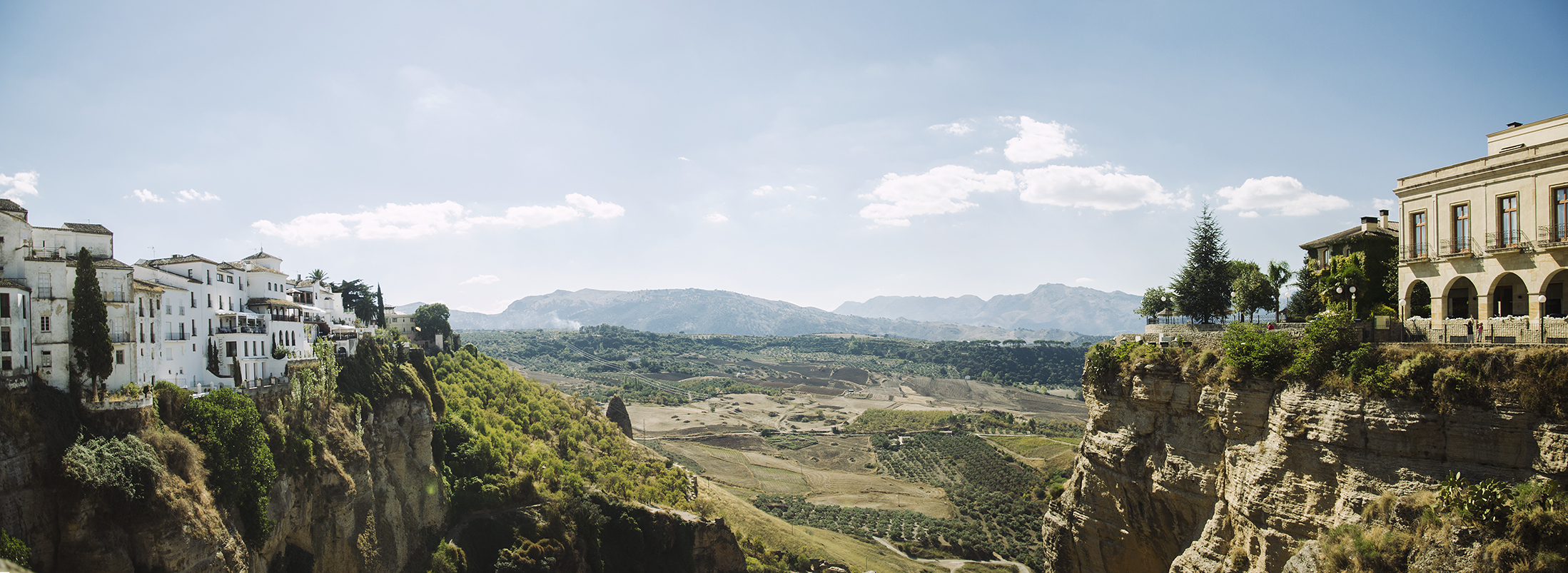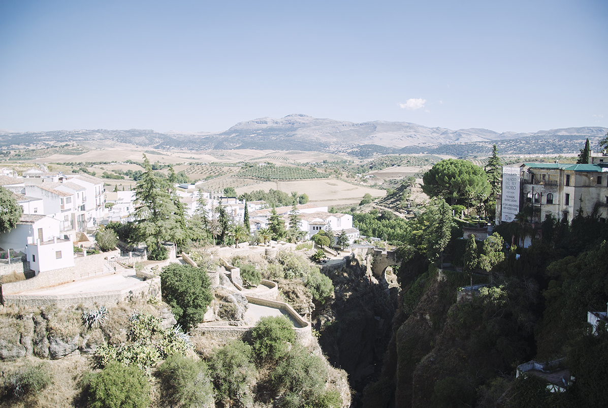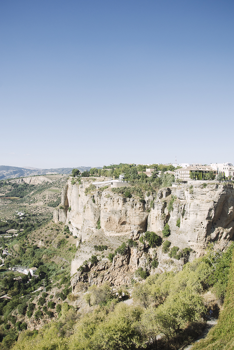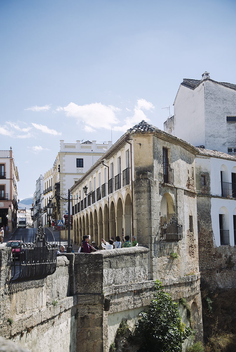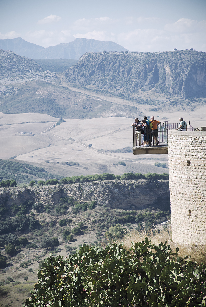 Kiedy dochodzi się do mostu Puente Nuevo krajobraz zmienia się totalnie. 100 metrów w dół płynie rzeka, nad skalnymi urwiskami stanowiącymi jej brzegi stoją białe kamienice, sprawiając wrażenie, że za chwilę runą w wąwóz. Ale to jeszcze nie koniec, lęk wysokości jeszcze się dobrze nie zagnieździł w głowie. Wystarczy nie wchodzić jeszcze na most, ale skręcić w prawo, kierując się do tarasu widokowego. Stąd rozpościera się widok na całą piękną okolicę: zieleń i góry. Widać też niewielką platformę wystającą poza „stały ląd” i turystów stojących na niej. Daleko w dół, dokładnie pod nimi kaktusy. Oj, lęk wysokości daje o sobie znać. Pora zatem wejść do starego miasta i pospacerować po wąskich uliczkach. Żeby to zrobić, trzeba wejść na ten 100-metrowy most. No tak, teraz, kiedy lęk wysokości nie daje o sobie zapomnieć, trzeba trzymać aparat mocniej.