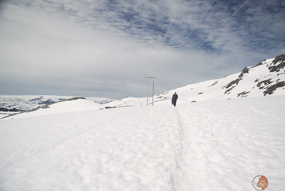 11 kilometrów w jedną stronę to niby nie tak dużo. Przy 900 metrach różnicy wysokości jest to trochę trudniejsze, ale wciąż do zrobienia. Skoro same zdjęcia zapierają dech w piersiach, a dziennie pokonuje tę trasę 500 turystów, to Trolltunga musi coś w sobie mieć. Pojechaliśmy więc ze znajomymi (którzy w Norwegii mieszkają) sprawdzić, co tak naprawdę kryje się za ekstra zdjęciami z Języka Trolla. Zaczęliśmy rano, ok. godz. 8. Samochód zostawiliśmy się na parkingu w Skjeggedal. Zaczynamy, wspinamy się po kamiennej, stromej ścieżce pokonując 1,5 kilometra i ponad 400 metrów wysokości (tory po dawnej kolejce są już całkowicie zamknięte i częściowo rozebrane, oficjalnie wdrapać się nimi już nie da, choć podobno wciąż są tacy, którzy to robią). Po wejściu na górę wydaje się nam, że gorzej być już nie może.W głowie mamy wszystkie blogi, które mówią, że potem jest już lekko, łatwo i przyjemnie, więc wspinamy się ze świadomością, że będzie już tylko lepiej. I na początku jest. Ale potem gubi się nam krem z filtrem (a słońce = żarówa), a kilka kroków dalej zaczyna się śnieg. I nie opuszcza nas już do końca. Warto zaznaczyć, że śnieg z trasy na Trolltungę zaczyna schodzić dopiero w drugiej połowie czerwca i robi to bardzo powoli. Idziemy zatem w śniegu i okazuje się, że najgorszy fragment dopiero przed nami. Bo strome, skaliste schody wcale nie są takie złe. Bardzo strome podejście w śniegu przez kolejne 300 metrów sprawia, że mam wrażenie, że przeszliśmy już z połowę trasy. A tu znak, że dopiero 3 km za nami… Dalej jest już lepiej. Wciąż góra-dół, góra-dół, ale nie tak stromo jak wcześniej. Potem długa prosta, całkiem nieźle się idzie jak na wydeptane dwa wąskie ślady w śniegu. Dochodzimy do kolejnej góry i widzimy zakręt. Myślimy: „to już za tym zakrętem, przecież tyle idziemy, na pewno pokonaliśmy już z 10 kilometrów”.