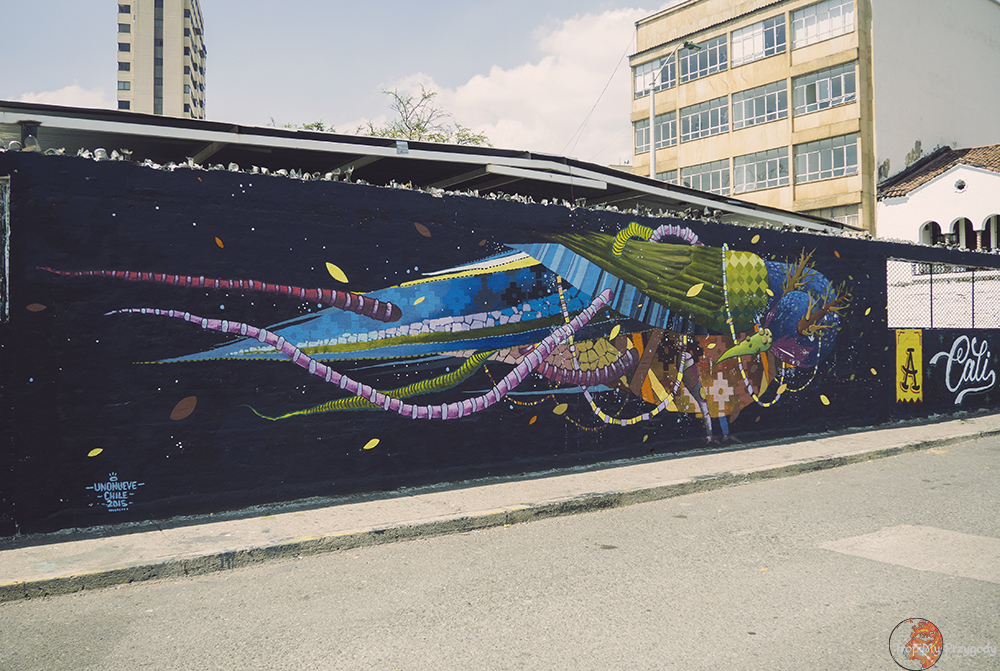 Pierwsze graffiti zaczęły pojawiać się już na San Antonio. Kolejne odkrywać zaczęliśmy podczas spaceru do centrum miasta po drugiej stronie ulicy (autostrady śródmiejskiej przecinającej serce miasta, co jest typowe dla tego regionu świata), gdy zmierzaliśmy do Muzeum Złota. Malunków na murach odkryliśmy nie mniej niż w Cartagenie, jednak w przeciwieństwie do jednego z najbardziej znanych miast Ameryki Południowej, o sztuce w Cali informacje wcale nie leżą na wyciągnięcie dłoni. Dotyczy to również, jak już wspomniałem, miejscowej informacji turystycznej. Graffiti w Kolumbii zawsze było (podobnie jak w wielu miejscach na świecie) głównie formą ekspresji, krzykiem opozycji, ludzi dyskryminowanych, głosem mówiącym o przeszłości oraz problemach współczesnych. Bardzo wiele z nich ma zabarwienie polityczne. Wielu artystów, jak wywodzący się z Kolumbii DJ LU, widzi w swoich pracach formę przekazu opowieści o przemocy, począwszy od partyzantki i paramilitarios, na przemocy ulicznej kończąc. Artyści w swoich pracach często odwołują się również do prekolumbijskich korzeni oraz wzorców. Większość grup, zwłaszcza antykapitalistycznych i antyimperialistycznych działa na terenie Bogoty, ale pozostawiają one ślady po sobie również w innych miastach, jak Medellín czy Cali.