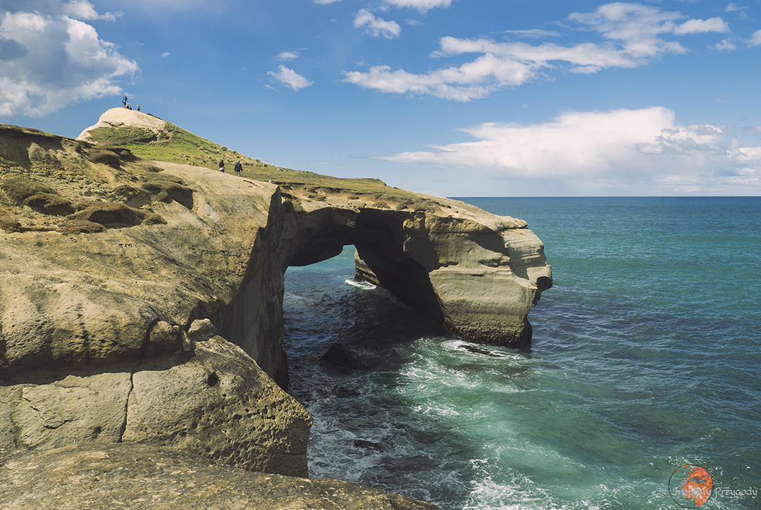 Jadąc dalej, przed samym Dunedin skręcamy na Tunnel Beach. Warto pamiętać o dobrych butach (nie japonkach, nawet jeśli są to havaiany!), gdyż miejscami będzie stromo i ślisko. Pierwsza część plaży to malowniczy tunel skalny, podobny do tych, jakie ostatnimi czasy zawaliły się w Maroku i na Malcie. Schodami w tunelu w skale przechodzi się na drugą, schowaną plażę i zatoczkę, miejsce jeszcze bardziej malownicze.