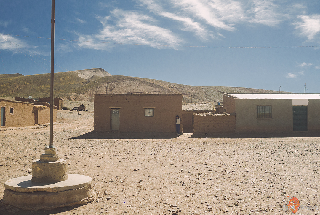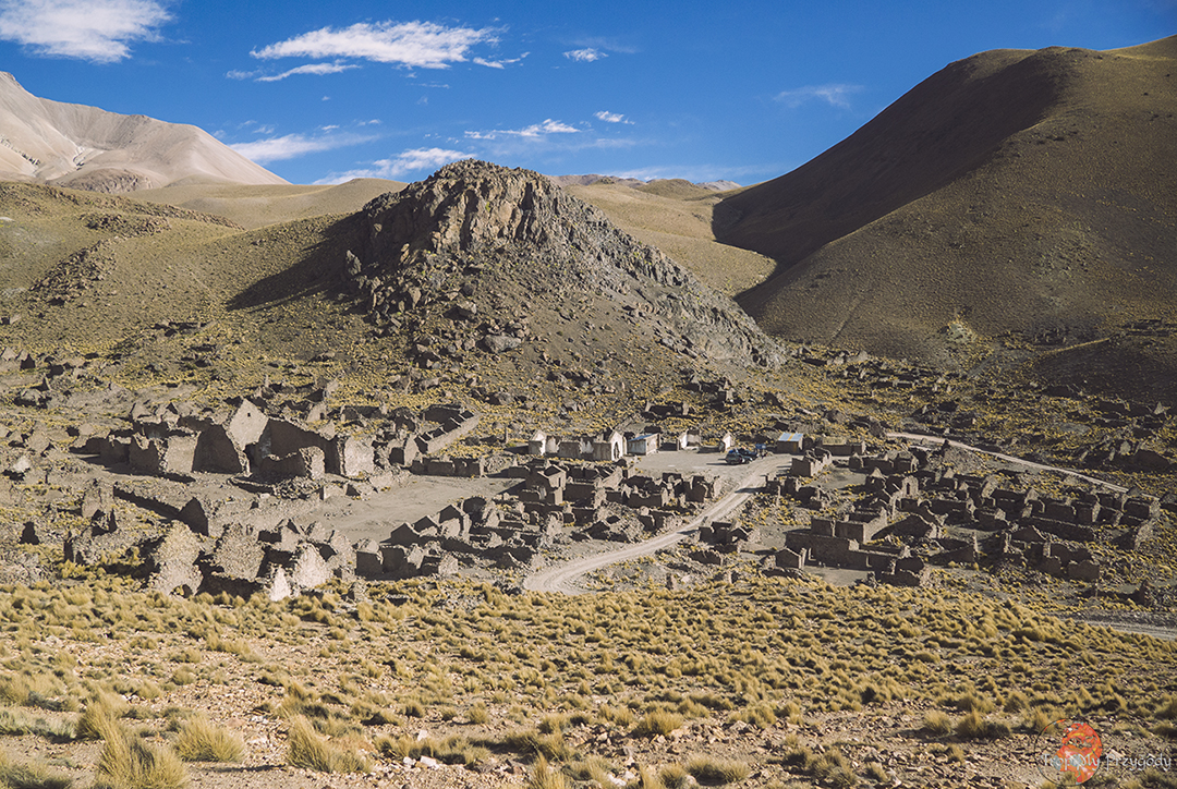 Na śniadaniu spotykamy się z Tonem z Tajlandii i parą irlandzko-walijską: Miriam i Kevinem. Dobrze nam się rozmawia przy śniadaniu, co dobrze rokuje na całą wycieczkę. Jest to ważne, gdyż nigdy nie wiesz, na jakich ludzi trafisz, a najbliższe dni spędzicie razem na bardzo małej przestrzeni jeepa. Pierwszy dzień to głównie jazda, zaledwie z kilkoma przystankami na oglądanie widoczków. Podróż rozkręca się bardzo, bardzo powoli. Ale to dobrze. Z każdym kilometrem, godziną, dniem jest coraz ciekawiej, aż do wielkiego finału ostatniego dnia. Lepiej tak, niż zacząć od wielkiego finału, największych zachwytów, aby później przechodzić od „o to też spoko” do „w sumie ok” i „może byśmy już dojechali?” 😉 Dojeżdżamy do ruin starego miasta kopalnianego. Od XVII wieku Hiszpanie wykorzystywali tu miejscową ludność (później także niewolników z Afryki) do prac wydobywczych. Dwa wieki później miasteczko zostało opuszczone, dziś przechadzać się możemy po jego ruinach, a jeśli znamy hiszpański to w pakiecie z wejściem usłyszymy również smutną historię ludzi, którzy tu niegdyś mieszkali. Po kilku godzinach jazdy dzieje się coś z oponą, więc nasz kierowca (Miguel) wymienia ją na zapas. Po kolejnych 20 minutach jazdy, zapas się przebija… Miguel zmienia ponownie oponę na tę poprzednią, a wieczorem, w hostelu ją naprawia. My siedzimy i ogrzewamy się rumem, który stawiają na stół Miriam i Kevin.