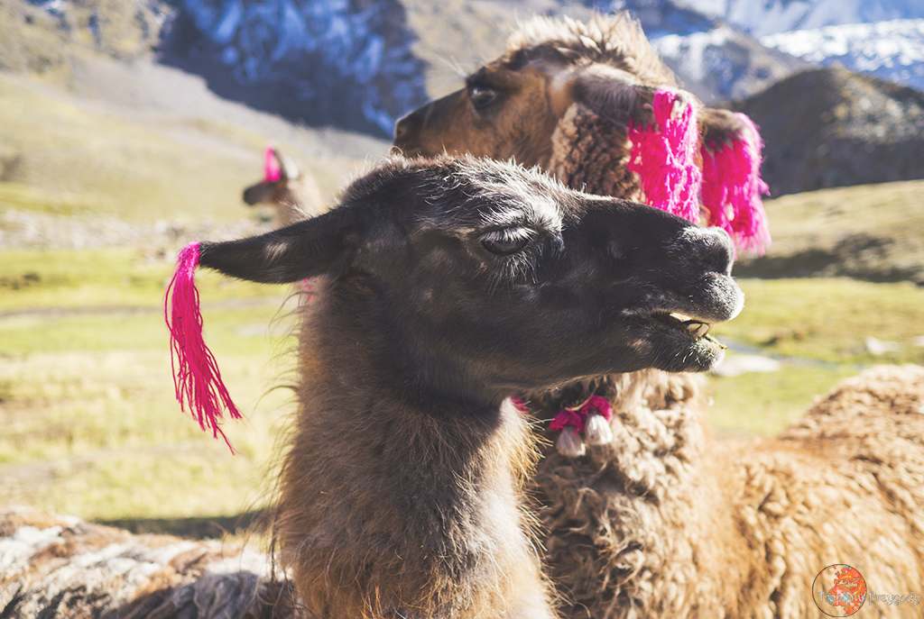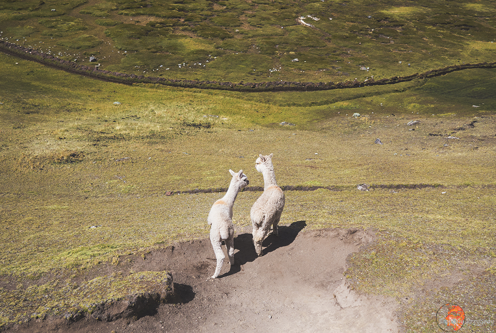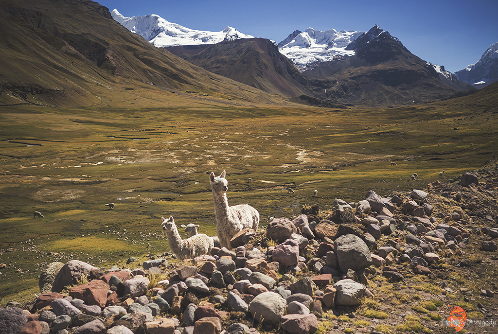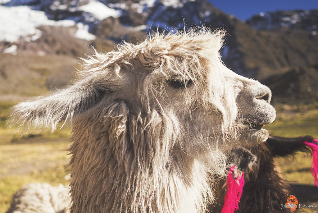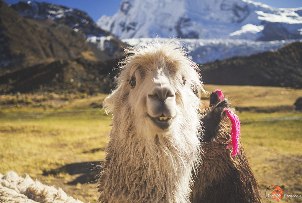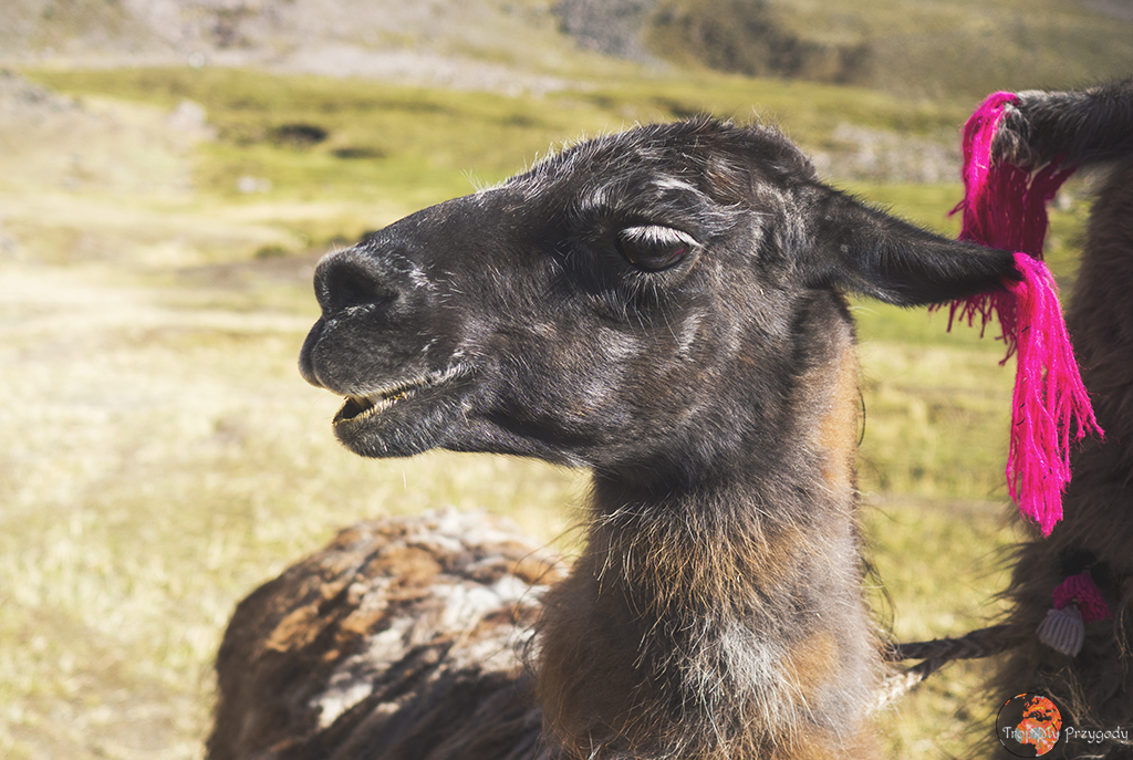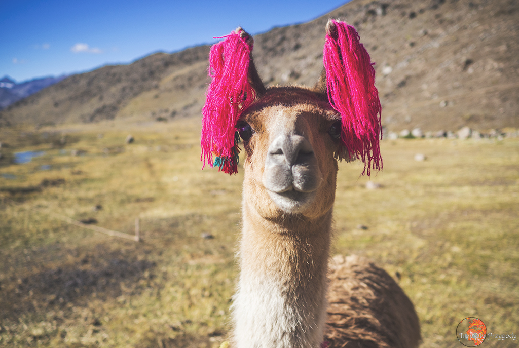 **Żadna lama nie ucierpiała przy robieniu zdjęć. Co więcej, wszystkie lamy zostały sfotografowane w środowisku naturalnym i bez nadmiernej ingerencji w ich egzystencję (lama, którą głaskałam to jedna z naszych tragarzy podczas trekkingu). Piszę o tym, bo lamy można też spotkać w miastach, gdzie kolorowo, tradycyjnie ubrane Panie ciągają te biedne lamy na sznurkach, często do tego ubrane w jakieś dziwne stroje i stają z nimi przy ruchliwych ulicach, żeby turyści mogli sobie z nimi robić zdjęcia za kilka soli. Rozumiem biedę i chęć zarobku, ale lama jest stworzona do plucia na trawę, a nie na chodniki. Zresztą, więcej o zwierzakach wykorzystywanych w turystyce przeczytacie u Przedeptanych. Jeśli będziecie w Peru czy Boliwii i chcecie zdjęcie lamy, to zamiast dać się skusić na zdjęcie z lamą w mieście – idźcie po prostu w góry.