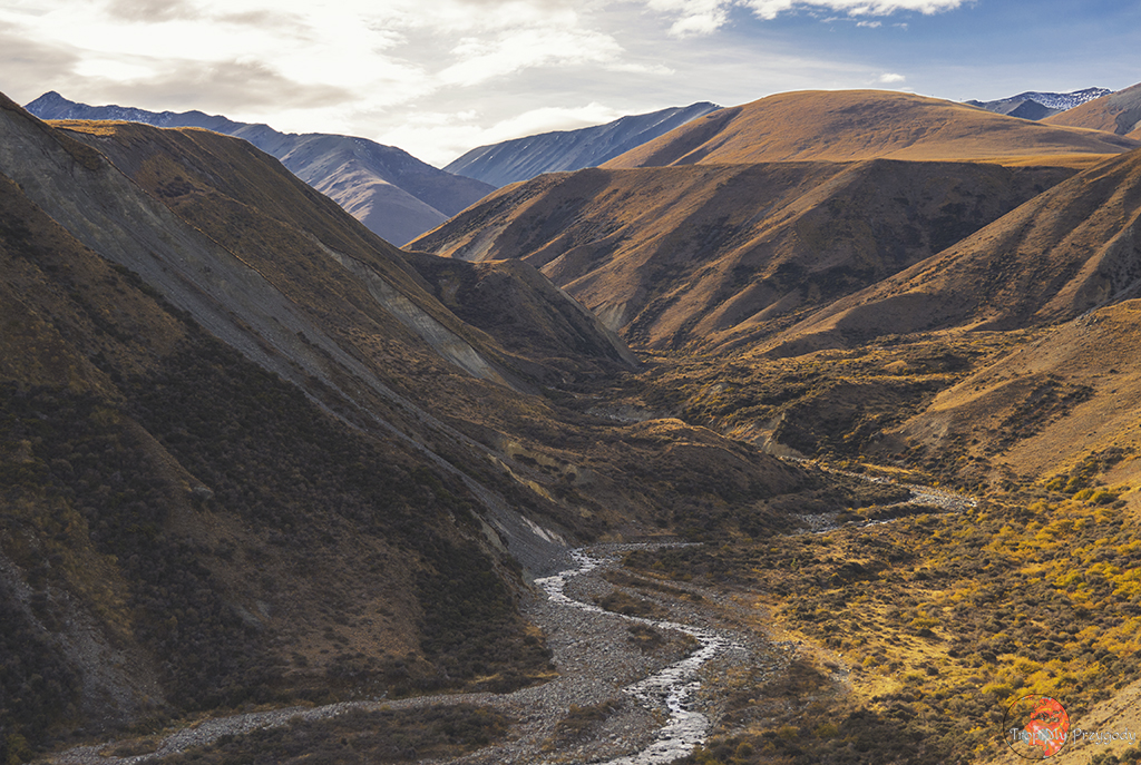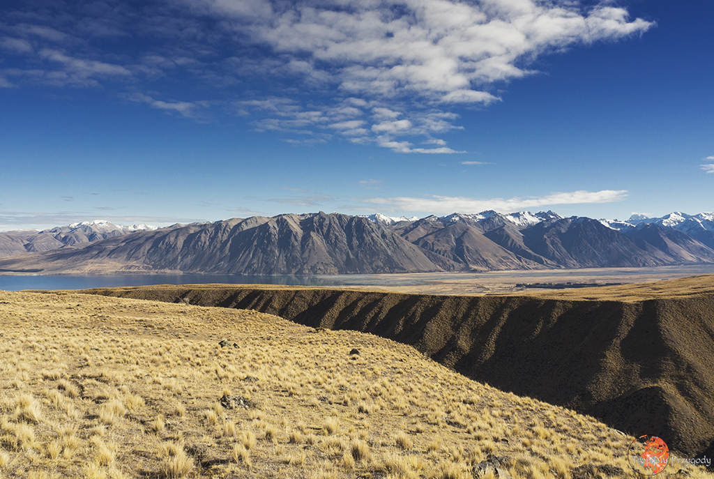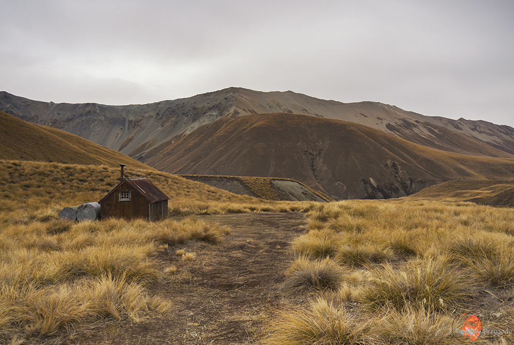 Z Lake Tekapo wyruszamy rano. Do początku trasy musimy dojechać szutrową drogą, jakieś 30 kilometrów. Zostawiamy samochód przed zamkniętą bramą, która nie pozwala przejechać dalej, choć to jeszcze nie jest początek naszego szlaku. Pierwszy etap nie jest zatem najciekawszy, bo idziemy szutrową drogą, lekko pod górę. Trochę zniecierpliwieni, po ok. godzinie docieramy do faktycznego szlaku. Zbaczamy więc z drogi prowadzącej do kompleksu narciarskiego Roundhill i wchodzimy na wąską ścieżkę pośród wysuszonych traw, która po kilku godzinach ma nas doprowadzić do naszej romantycznej chatki w górach. Pierwsza część jest bardzo przyjemna: piękne widoki, prawie cały czas płasko – idealnie. Idziemy wzdłuż kanionu, który będziemy musieli przeciąć. Ledwie widoczna ścieżka zaczyna nas prowadzić po stromej ścianie w dół. Schodzimy. Ja oczywiście zaczynam narzekać, że będziemy musieli wrócić tą samą drogą i wspinać się po tej niezbyt przyjaznej stromiźnie. Po bardzo wąskich ścieżkach na andyjskich stromych zboczach w Kanionie Colca i nieopodal Tęczowej Góry przestałam czuć się komfortowo ze świadomością, że nie będę miała się na czym zatrzymać, jeśli źle postawię nogę. Zeszliśmy jednak w całości, bez turlania się po zboczu.