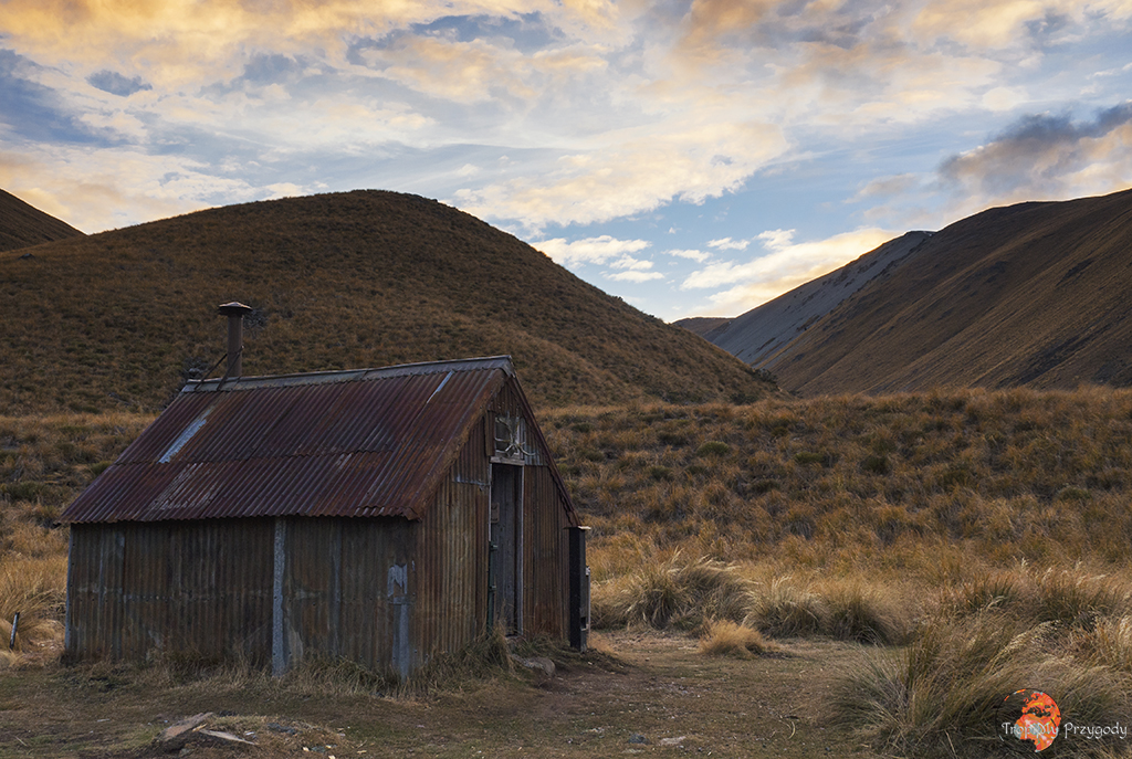 Nieopodal ostatniego stromego podejścia, za którym czekała na nas pusta chatka musieliśmy przejść drugą rzekę. Wprawdzie tę dało się pokonać po kamieniach, ale na tyle śliskich, że tym razem Bartek wpadł jedną nogą do wody, dołączając do teamu z jednym mokrym butem. Cóż zrobić, przygoda. Kiedy po stromym podejściu naszym oczom ukazała się niewielka polana, a na niej Camp Stream Hut, wiedzieliśmy, że było warto. W blaszanym domku nikogo, dookoła cisza i pustka. Tylko na przeciwległym zboczu owce podskubywały trawę i zafrapowane naszą obecnością spoglądały, kto im się kręci po okolicy.
