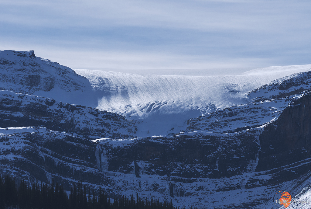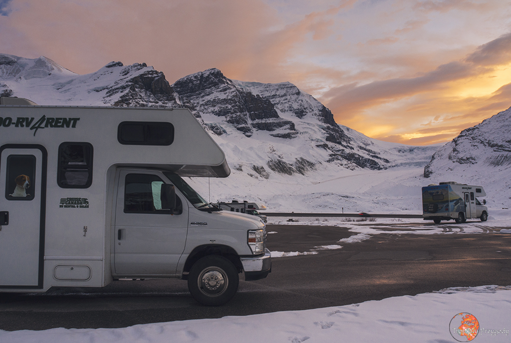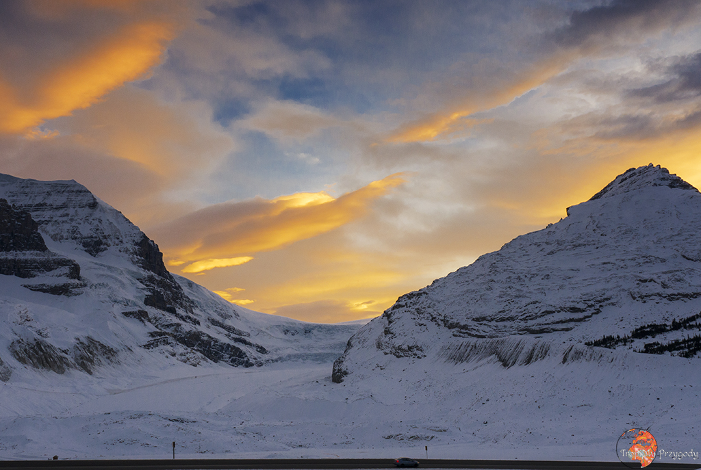 Columbia Icefield Discovery Centre – leży na granicy Parku Narodowego Banff z Parkiem Narodowym Jasper (właściwie już na jego terenie), ale warto o nim tu wspomnieć. W Centrum (wielki budynek przy parkingu) możecie sobie za miliony monet kupić przejażdżkę autobusem do lodowca lub tzw. sky walk, czyli krótkie przejście kładką podwieszoną przy zboczu góry. Jeżeli nie chcecie (jak my) wydawać tam nie-wiadomo-ile-kasy, to i tak warto się zatrzymać. Przyjemnym spacerem dojdziecie prawie pod jęzor lodowca (dzięki tabliczkom ulokowanym po drodze zobaczycie, jak zatrważająco szybko lodowiec się cofa). Możecie tu również zostać na noc, śpąc w aucie na parkingu dla kamperów (informacje poniżej) lub darmowym campingu dla namiotów (czynnym tylko latem). Nocleg z widokiem na zachód i wschód słońca nad lodowcem – czego chcieć więcej?