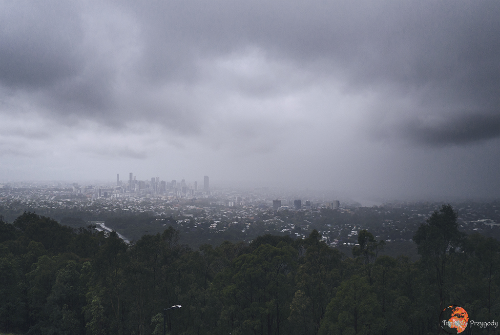 Brisbane przywitało nas ciemnymi, burzowymi chmurami, które bynajmniej nie trzymały nas długo w niepewności, czy lunie, czy nie. Przez cały nasz pobyt w mieście z przerwami padało, wiało, albo jedno i drugie. Ale nic to, nie przesiedzimy przecież naszych pierwszych paru dni w Australii zamknięci w czterech ścianach. Swoje trzeba wychodzić, kurtki przeciwdeszczowe mamy, więc zwiedzanie Brisbane może odbyć się równie dobrze w deszczu. I tak właśnie było.